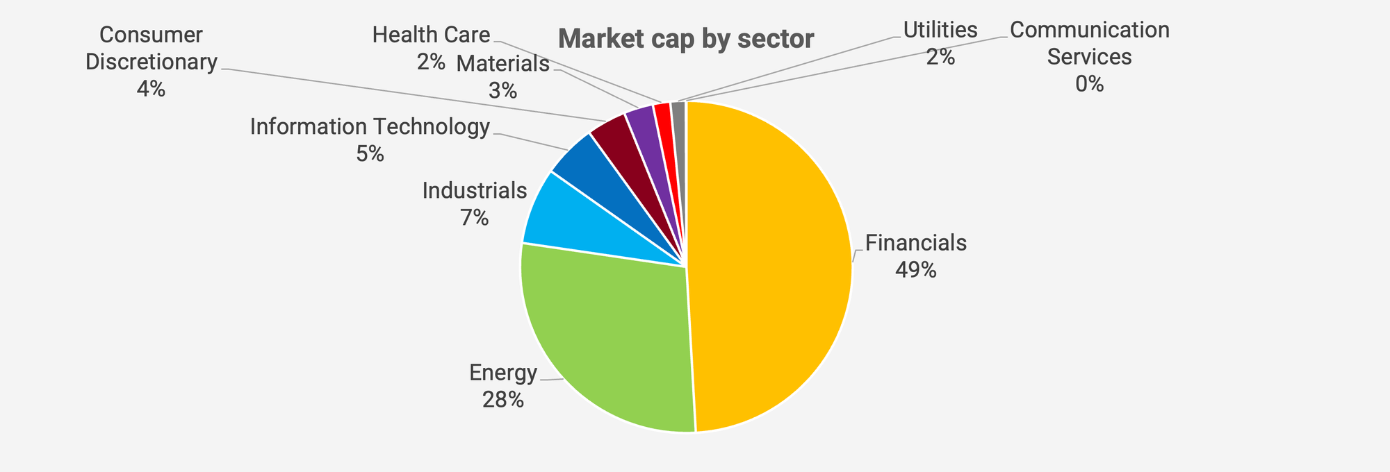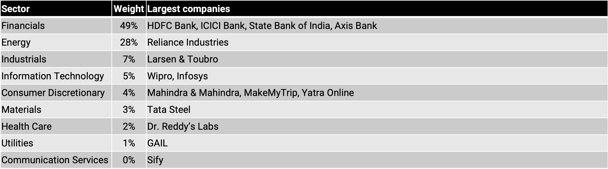 I found 16 depositary receipts of Indian companies traded actively in London and New York. Weighted by market cap, roughly half are financials such as HDFC Bank and ICICI Bank. Another 28% are in energy, specifically Reliance Industries. The rest include several tech businesses and industrials.