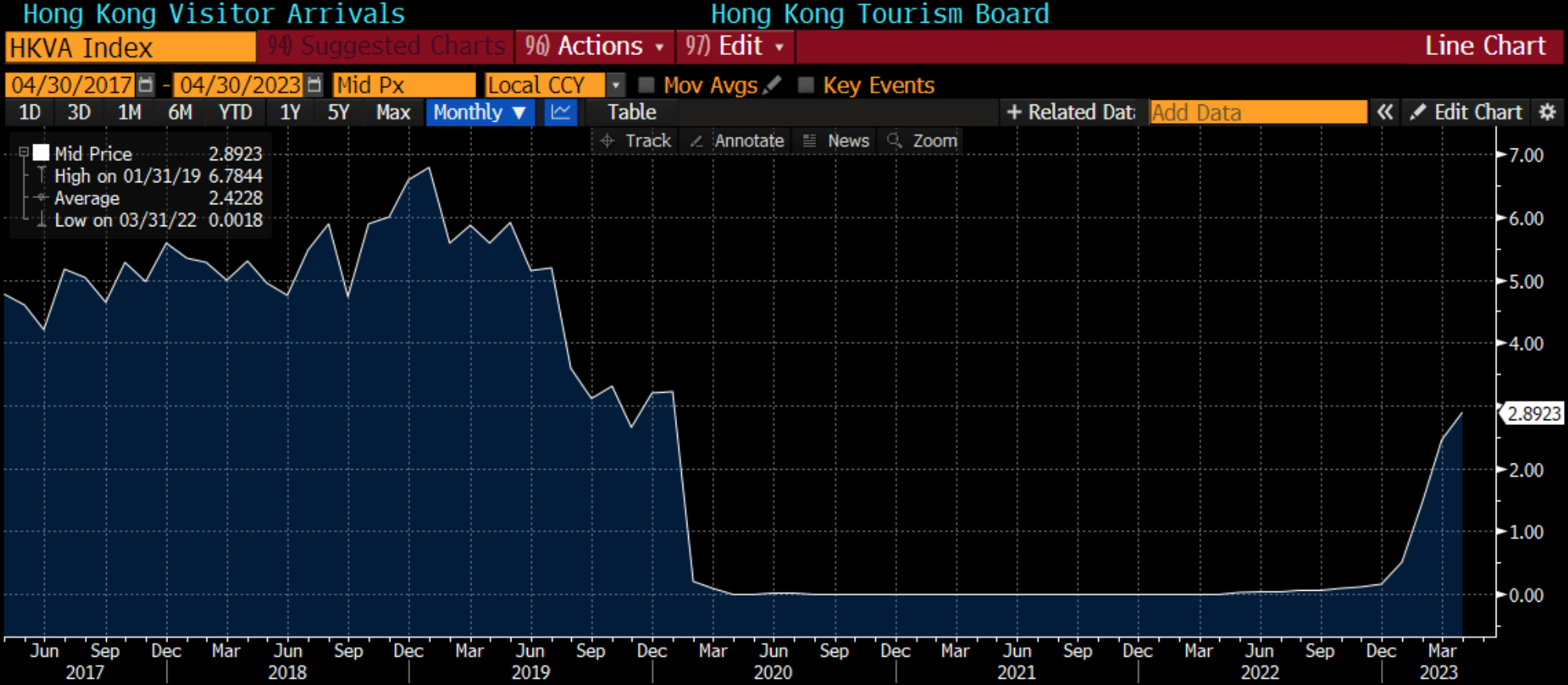 Since the border reopening, mainland Chinese tourism has gone bananas. In April 2023, the number of mainland Chinese visitors reached 2.3 million. The total number of visitors to Hong Kong has now reached 2.9 million people: