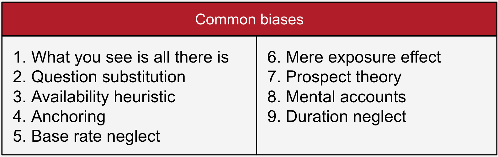 In the book, Kahneman lists a set of biases that we tend to fall prey to: