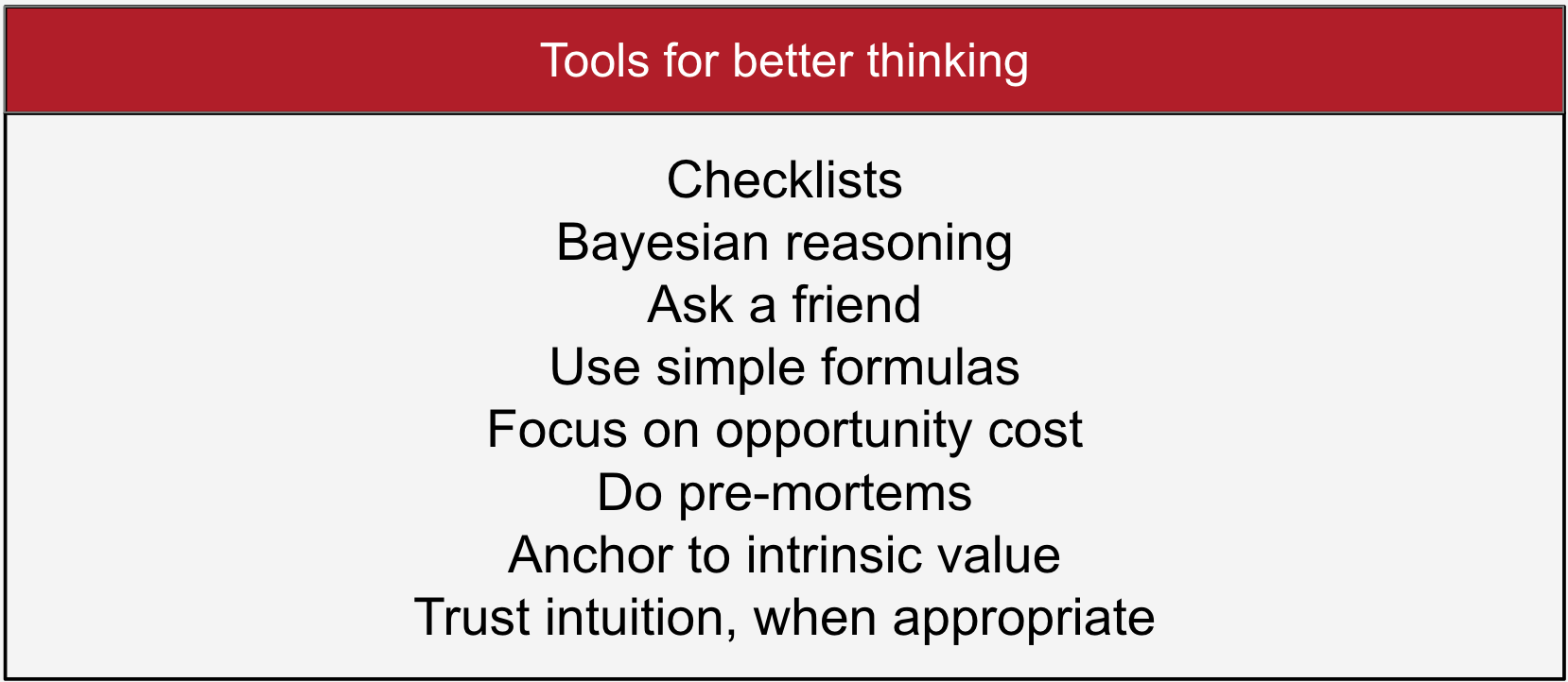 I've come up with a list of eight tools that we can use to make more rational decisions, directly inspired by the recommendations in the book: