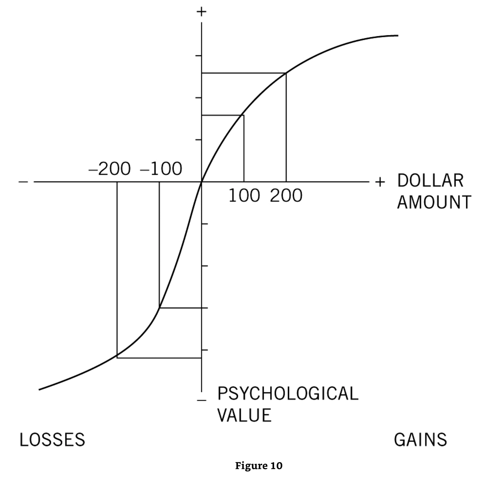 What Kahneman is perhaps most famous for is his finding that people are naturally risk-averse. His so-called Prospect Theory showed that losses hurt much more psychologically than gains: roughly 2x as much. So we tend to prefer the status quo. Here's how the psychological value tends to shift with gains or losses: