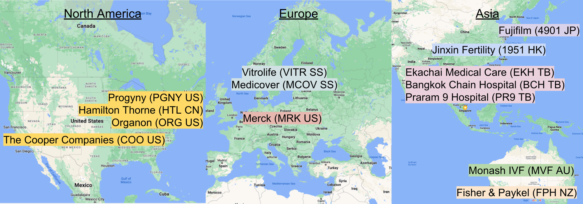 Other equipment suppliers such as The Cooper Companies (COO US), Fujifilm (4901 JP) and Fisher & Paykel (FPH NZ) have only limited exposure to the IVF industry and should, therefore, not be considered pure-play IVF stocks.