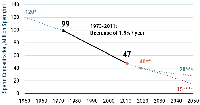 A study by Levine & Swan (2017) showed that the sperm count had decreased at a rate of 1.9% per year until 2011. Investor Jeremy Grantham believes if the current trends continue, the median couple will have trouble conceiving by the mid-2030s.