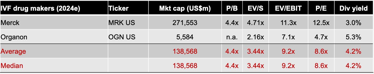 In 2021, Merck spun off Organon (ORG US), which owns medicines such as Ganirelix, Follistim and Pregnyl, which are used in IVF treatments. I estimate that Organon has a high-single-digit revenue contribution from IVF drugs. There was a short write-up on Organon on Value Investors Club here, with limited analysis, though pointing out that post-spin-off selling pressure might have pushed down the share price.