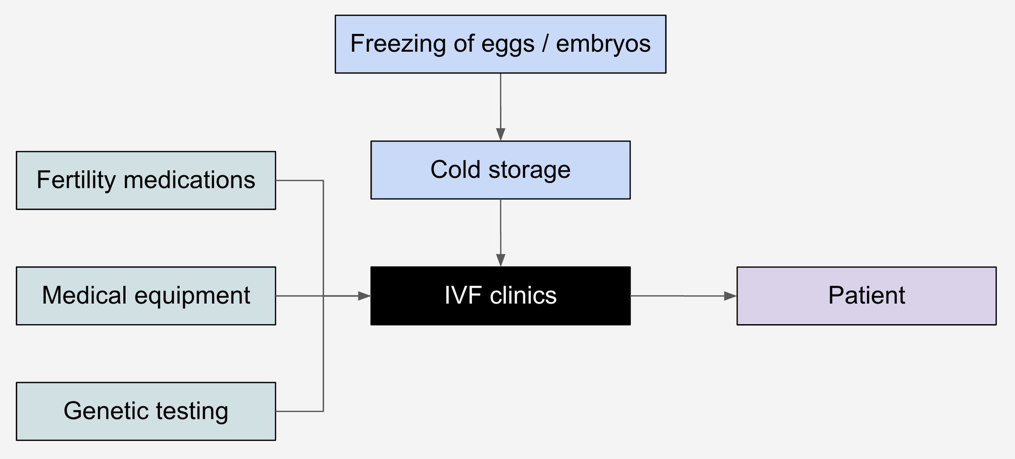 Patients are served by IVF clinics, which may be standalone or residing in larger hospitals. The freezing of eggs or embryos and the actual IVF procedure can occur in the same clinic, but that’s not always the case. Meanwhile, suppliers to the IVF clinics include drug manufacturers, producers of medical equipment and consumables and genetic testing companies.