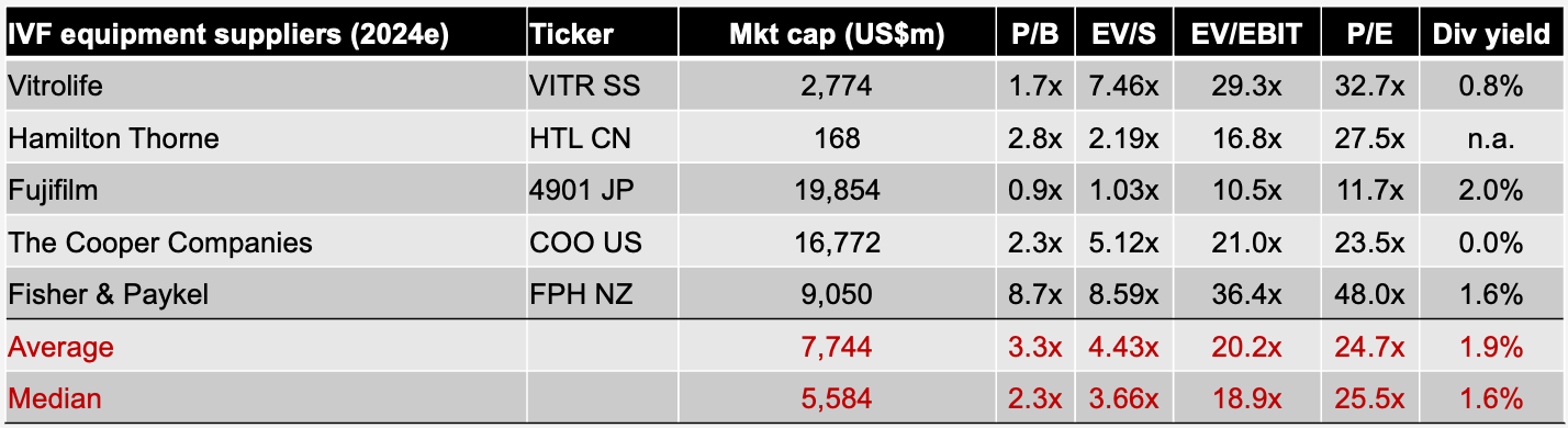 Other equipment suppliers such as The Cooper Companies (COO US), Fujifilm (4901 JP) and Fisher & Paykel (FPH NZ) have only limited exposure to the IVF industry and should, therefore, not be considered pure-play IVF stocks.