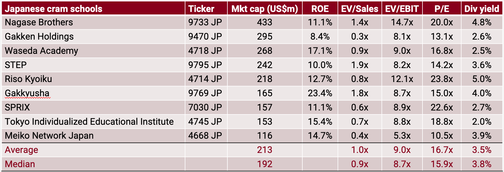 Here is what the investable universe of publicly listed cram schools looks like in Japan: