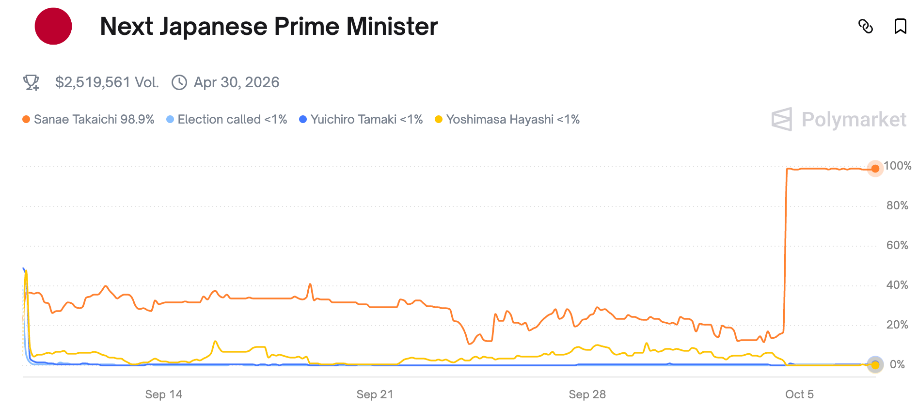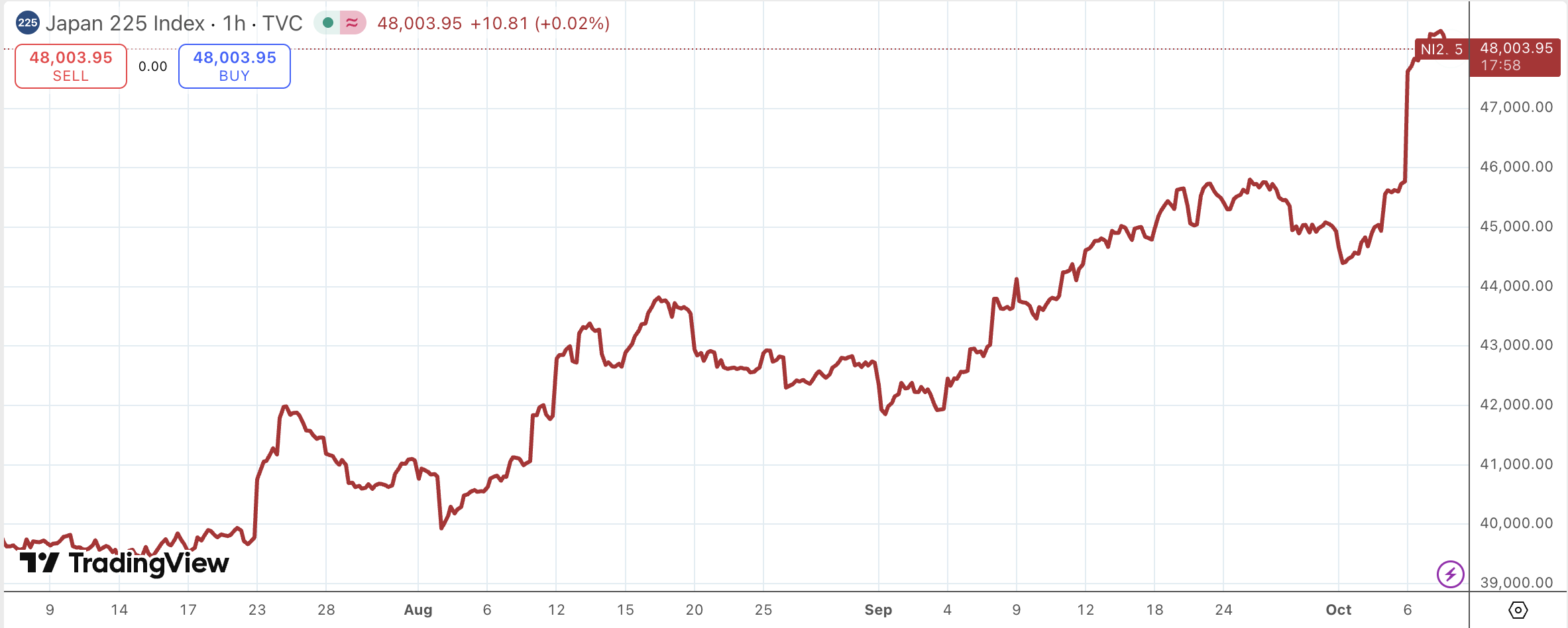 Following the news of Takaichi's win, the Nikkei jumped 4%. The Japanese Yen to US Dollar exchange rate rose from 147 to 150. And the 30-year government bond yield moved from 3.15% to 3.30%. It looks like the market is now pricing in greater fiscal stimulus and a more dovish Bank of Japan.