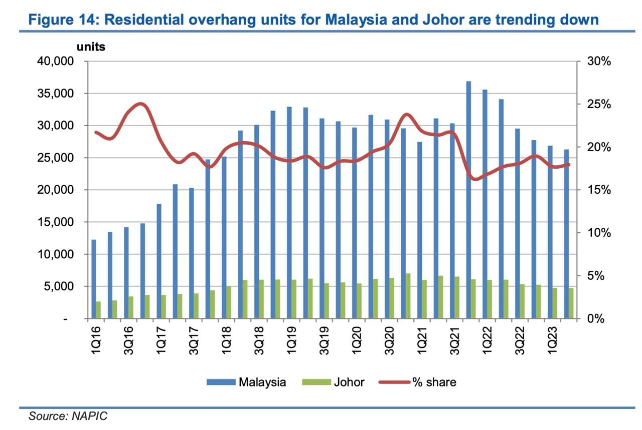The post-2006 property boom also touched other parts of Johor. The inventory of unsold residential property rose throughout the 2010s until a peak in 2022. Only now are we seeing the property market become more balanced again.