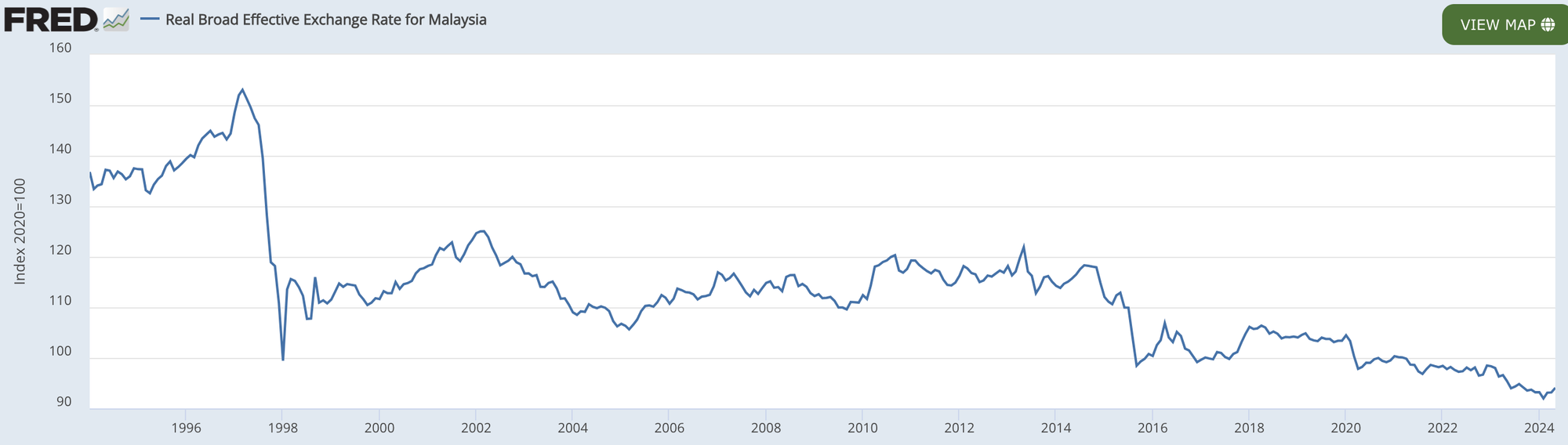 It also helps that Malaysia’s currency - the “Ringgit” - remains cheap, with its real effective exchange rate recently hitting multi-decade lows: