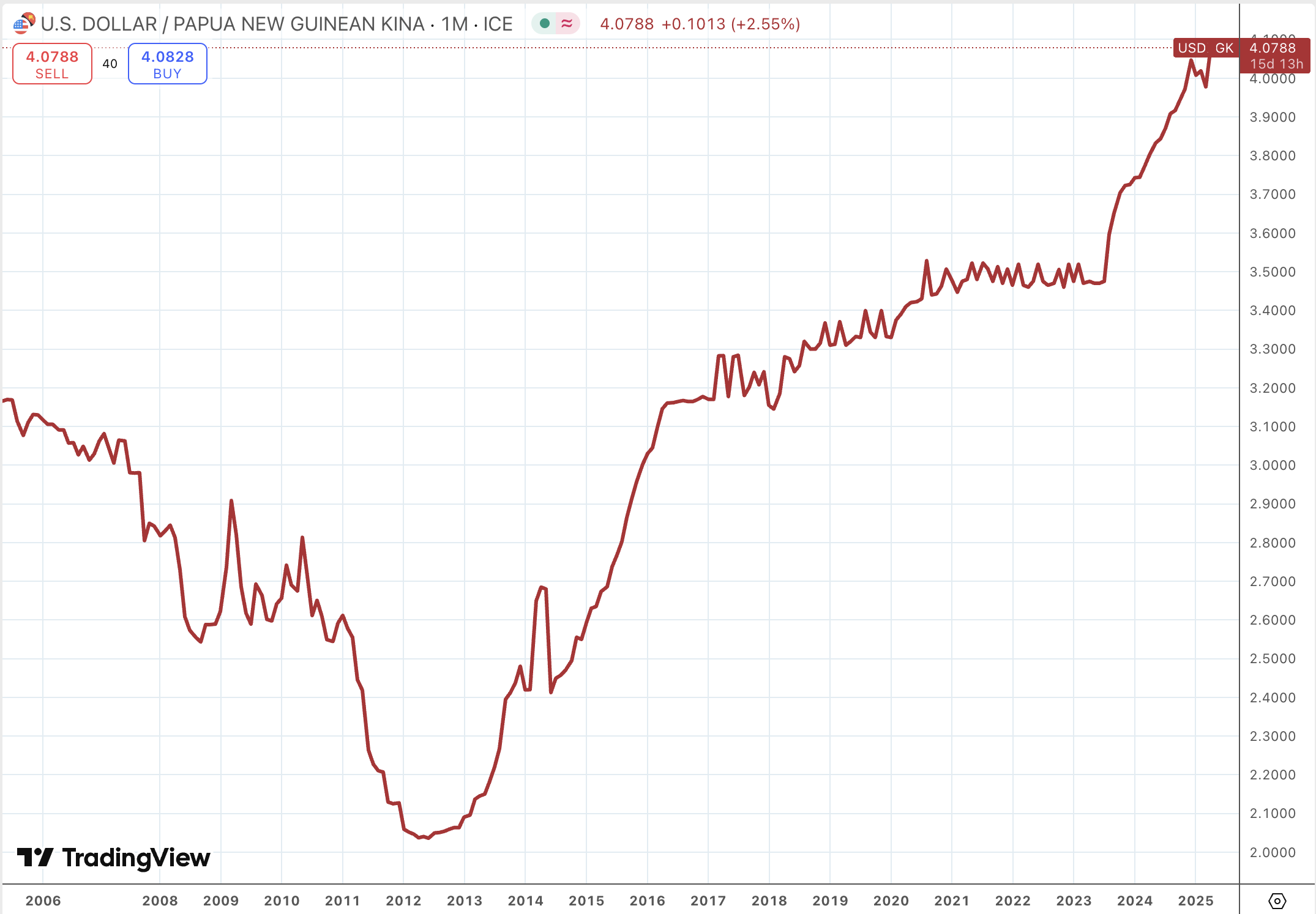 The country’s currency is the “Papua New Guinean Kina” or simply “Kina,” abbreviated as “PGK.” One US Dollar is worth around 4.1 PGK. I don’t expect significant volatility in the exchange rate.