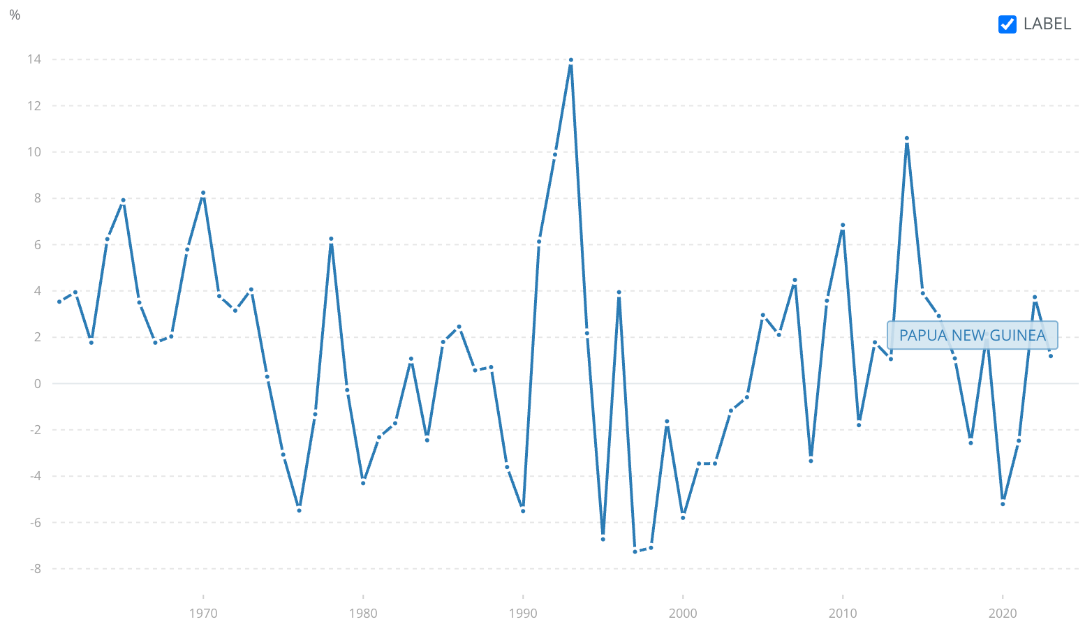 It is a resource-rich country, however. It has plenty of natural gas, crude oil, and gold developed by global resource companies such as Exxon Mobil, Total and Santos. Resource extraction is about 30% of GDP and is likely to grow. Four major resource projects are in the pipeline with aggregate investments of about US$30 billion. Hopefully, those will yield benefits for years to come. That said, PNG’s real GDP per capita growth has been modest in the past: