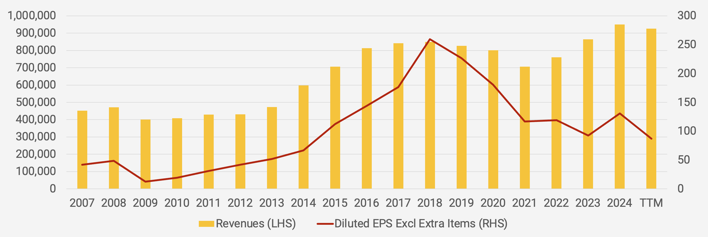 Koito’s revenues have already recovered nicely following the 2022 end of the semiconductor chip shortage. Yet its earnings per share has continued to lag: