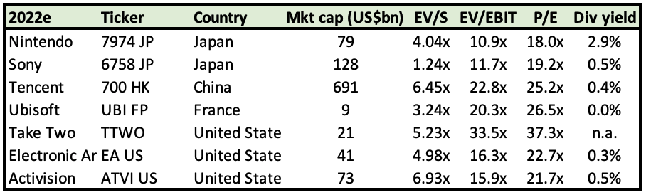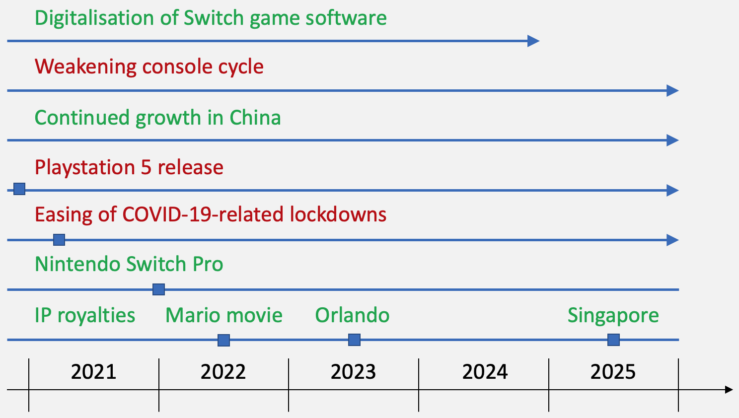 The ongoing digitalisation of Nintendo Switch sales, their entry into China and the Switch OLED are clearly positive growth drivers. On the other hand, the fact that Nintendo Switch is late in its console cycle, new competition from Playstation 5 and a potential end to COVID-19 are likely to weigh on earnings in the near term.