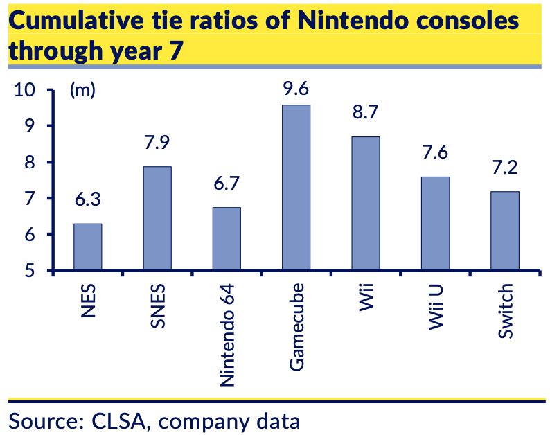 Another aspect is the console attach rate (also known as “tie ratio”), i.e. the software sales volumes divided by console unit sales. Nintendo Switch’s attach rate is among the lowest of any Nintendo console so far. That could provide some upside if new game releases prove popular. I think Nintendo Switch could eventually get to an 8.0x attach rate.