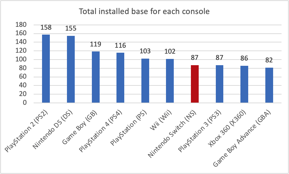 Another way to measure the potential for each console is to estimate the total installed base for each generation. Nintendo Switch is now at close to 90 million compared to 102 million for Nintendo Wii and 116 million for Playstation 4. That seems to suggest that Switch has now become a mature console and that we are nearing the end of the Nintendo Switch hardware cycle. I believe that the installed base will reach close to 150 million in the end - but only if you include Switch Lite, Switch OLED and future upgrades.