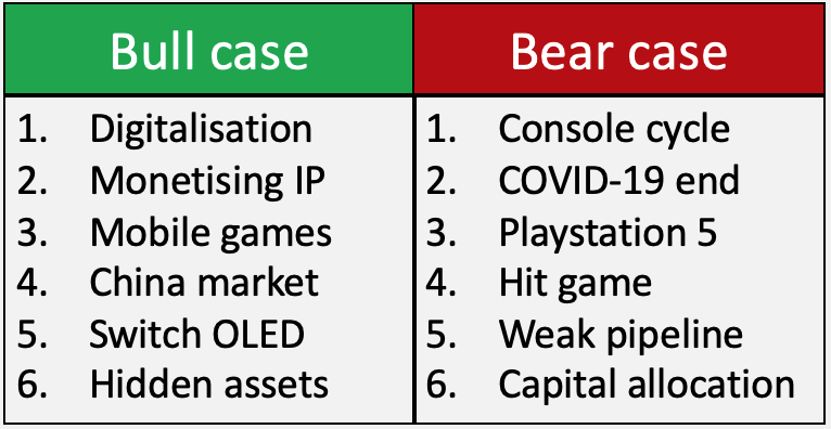 The digitalisation trend is real. But so is the console cycle. Ask yourself whether you are more likely to buy the Playstation 5 than the Switch OLED. For me, it’s a no-brainer - in favour of Playstation 5. At $350, I suspect the Switch OLED will flop. The Switch console cycle will remain negative.