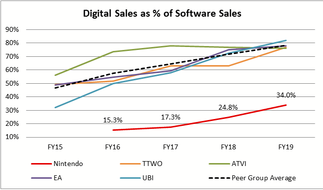 Today, digital sales represent 36% of all of Nintendo’s revenues, and this ratio is going up. Key American peers Electronic Arts, Take-Two Interactive and Ubisoft, enjoy close to 80% share of sales from digital.