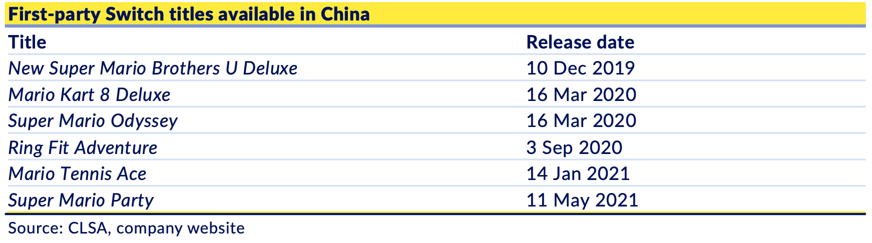 The Nintendo Switch has been available in China through a partnership with Tencent since December 2019. The Switch console costs US$321 in China as well, whereas Nintendo Switch games tend to be 20% cheaper there than in the rest of the world. The deals of the cooperation agreement with Tencent have not been disclosed, but presumably, a chunk of the economics will go to Tencent. Most of the major Nintendo Switch games have been released in mainland China, except Legend of Zelda: Breath of the Wild.