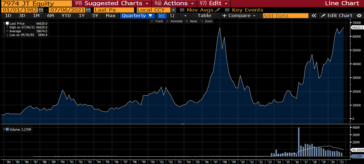 In 2019 and early 2020, US hedge fund ValueAct took a US$1.1 billion position in Nintendo around the $40/ADR level. ValueAct’s thesis is that Nintendo has potential for growth in its software business and a transition to a broader entertainment company. The ValueAct thesis is centred around Nintendo’s ongoing digitalisation efforts.