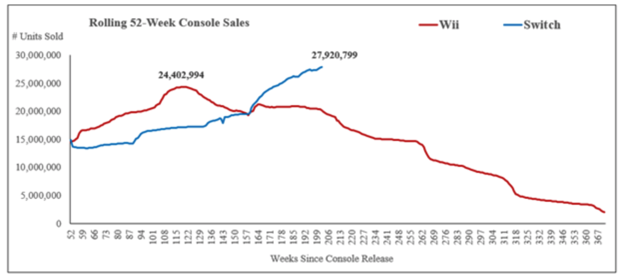 Nintendo Switch has yet to peak even after 4 years since its launch. It could be related to the fact that Switch is both a home console and a handheld console at the same time.