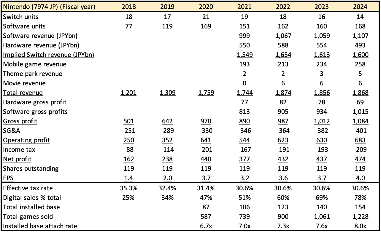 I’ll now make a few assumptions: Switch unit sales to peak in 2020 then drop 12% in 2021 and then 20% per year, additional Switch OLED sales of 3, 2, 1 million extra units from 2022 onwards, ARPUs rising to $320 as Switch OLED takes over, a digitalisation rate of 78% by 2024, mobile game revenue, SG&A rising at a 5% yearly rate and installed base attach rate/tie ratio of 8.0x at maturity.