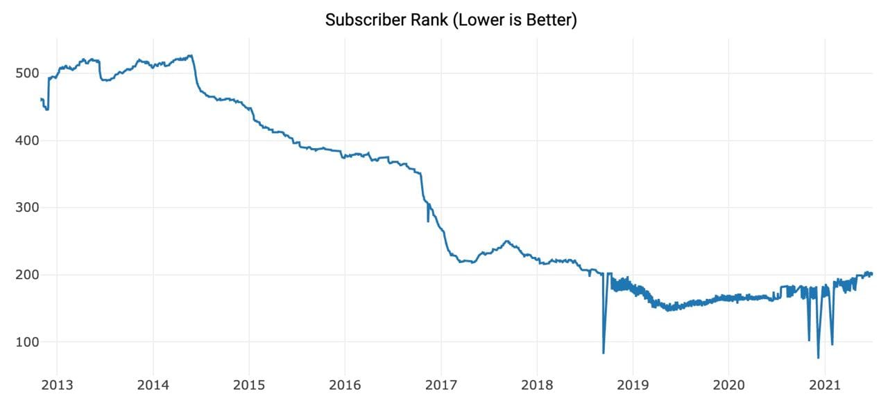 The subscriber rank on the r/Nintendo subreddit peaked in mid-2019 (2 years after launch) and is now falling gradually (the below chart is a subreddit ranking representation, i.e. lower line means that the subscriber count is higher). I believe that the pandemic prolonged the Switch console cycle but that it is now about to turn down.