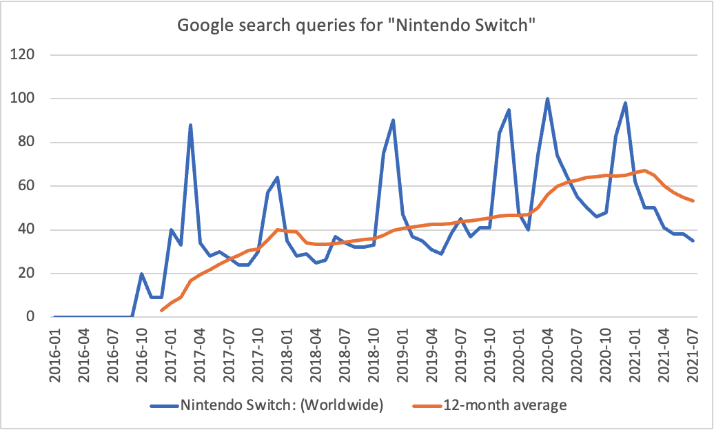 Google search queries for “Nintendo Switch” worldwide have now started to drop since March 2021. It could be related to recovery from COVID-19. But it could also be due to the Nintendo Switch console cycle turning.