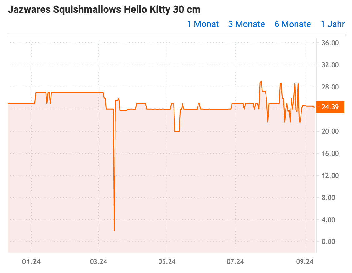 To take an example from the Hello Kitty universe, the Jazwares Squishmallows Hello Kitty 30cm plush toy currently costs EUR 24.39 on eBay. One year ago, it cost EUR 24.99.