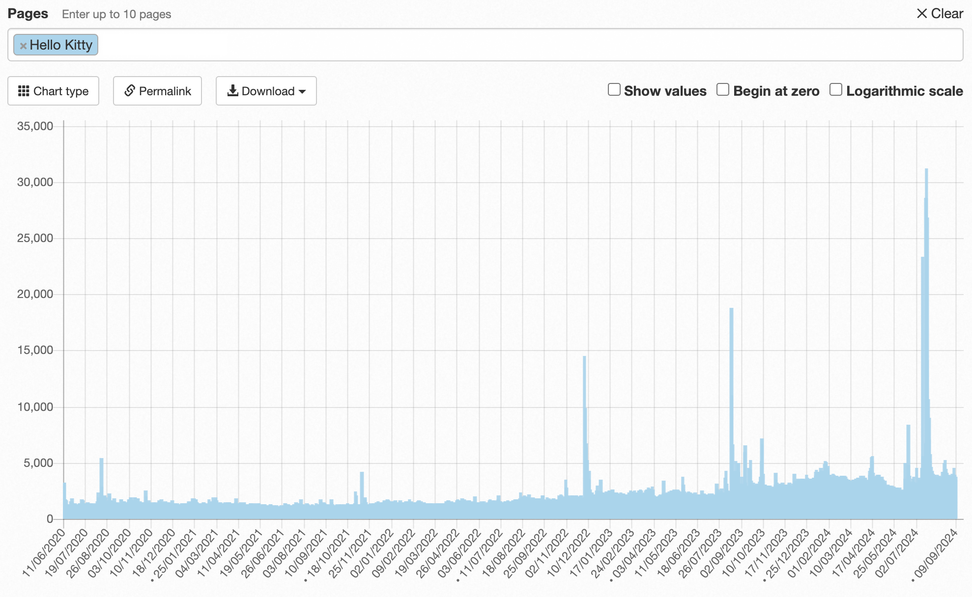 In Hello Kitty’s case, we can see that the number of Wikipedia page views has been increasingly steadily over the past few years, especially since 2021 when the hype really took off. I notice the same trend for the Sanrio page. The Japanese Wikipedia page “ハローキティ” also saw a spike in page views at the end of 2023.