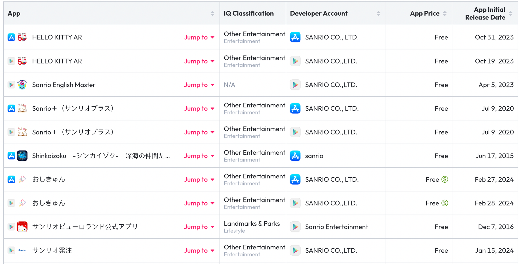 I usually search for a particular company to see what apps they have developed. In this case, the most important property to measure, in my view, is Sanrio+, the membership app that gives discounts and special deals to Japanese customers.