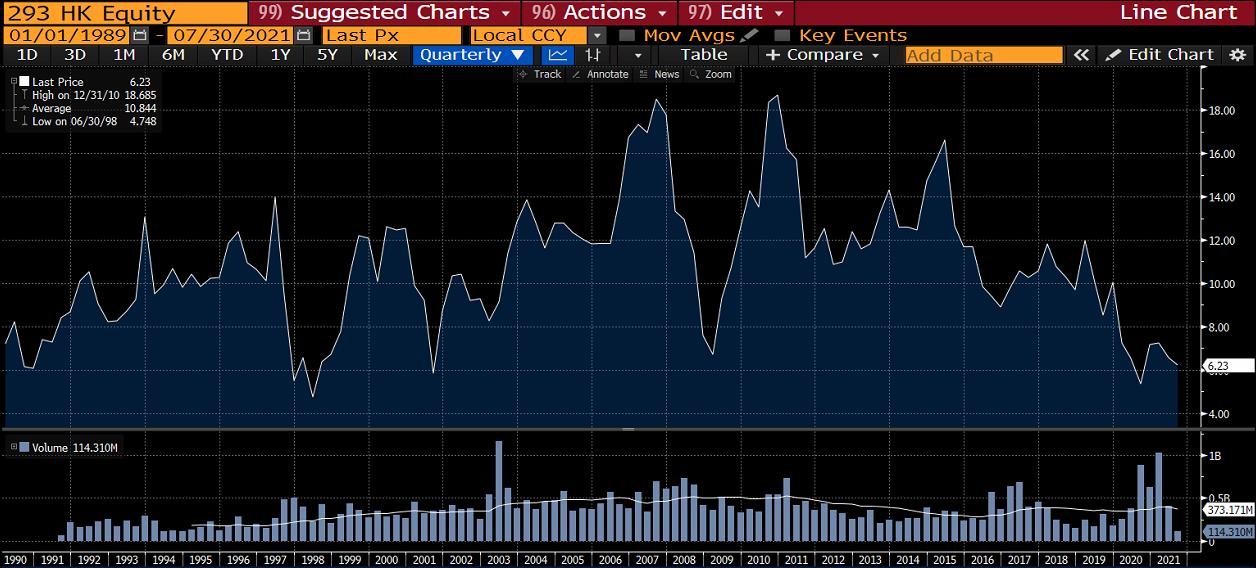 One stock that Cantwell liked was Hong Kong airline Cathay Pacific. The airline was a very well-managed company in his view and had fallen to a low level compared to its historical range.