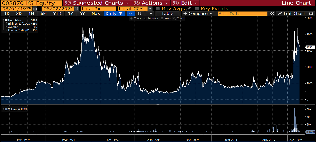 The rest of his portfolio had similar types of inexpensive, compounder-type stocks that most had never heard of. Song Woun Industries, Winton Holdings, Pacific Insurance and Samsung Radiator. Most of them at P/E ratios of 5-8x.