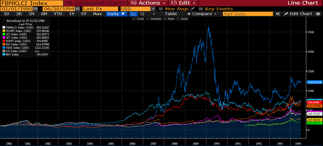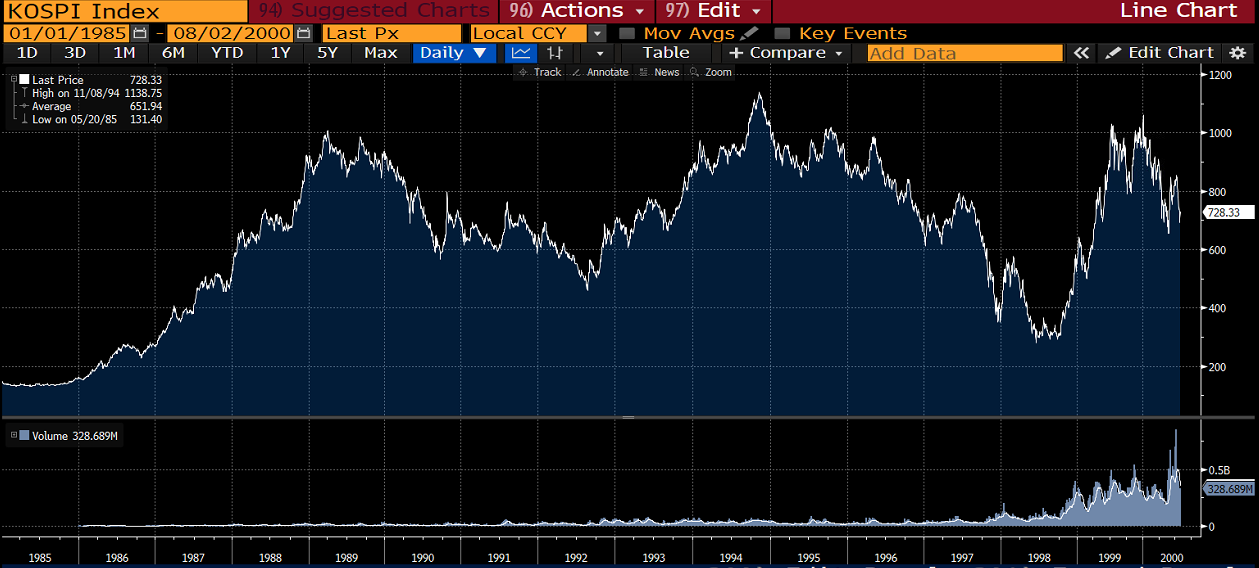 Claire Barnes book was written in 1994. The major East Asian stock markets such as Japan, Korea and Taiwan rallied throughout the 1980s, peaking around the turn of the decade. The culprit was an easy monetary policy in Japan, with credit flowing into financial assets. Some of that money found its way into Korea and Taiwan, which at that time had just begun to open up their capital markets to foreign investors. A mania ensued, as I wrote about in this post about the 1980s bubble in Taiwan.