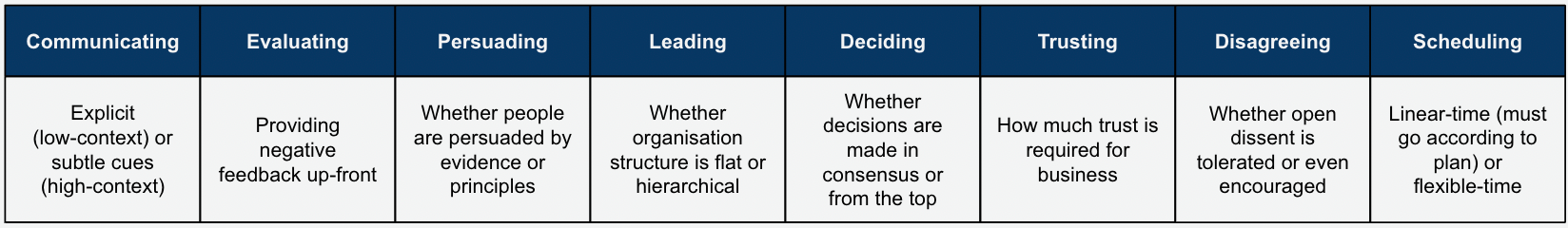 Erin Meyer looked at her survey data and concluded that cultural differences were rooted in eight key dimensions: