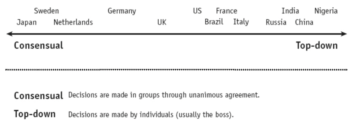 Japan is unique in the way that decisions are made. In the so-called “ringi system” of decision-making, consensus is formed at each level of the hierarchy. And once that consensus decision has been made, the question is pushed up to the next level. Meyer believes that this system is time-consuming and introduces accountability issues, with little incentive to stand out and challenge the consensus.