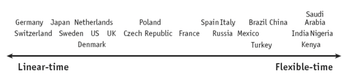 And then we have cultures working at a completely different time scale, those that tend to be flexible about time. India, Kenya, Nigeria, etc., belong to this part of the spectrum.