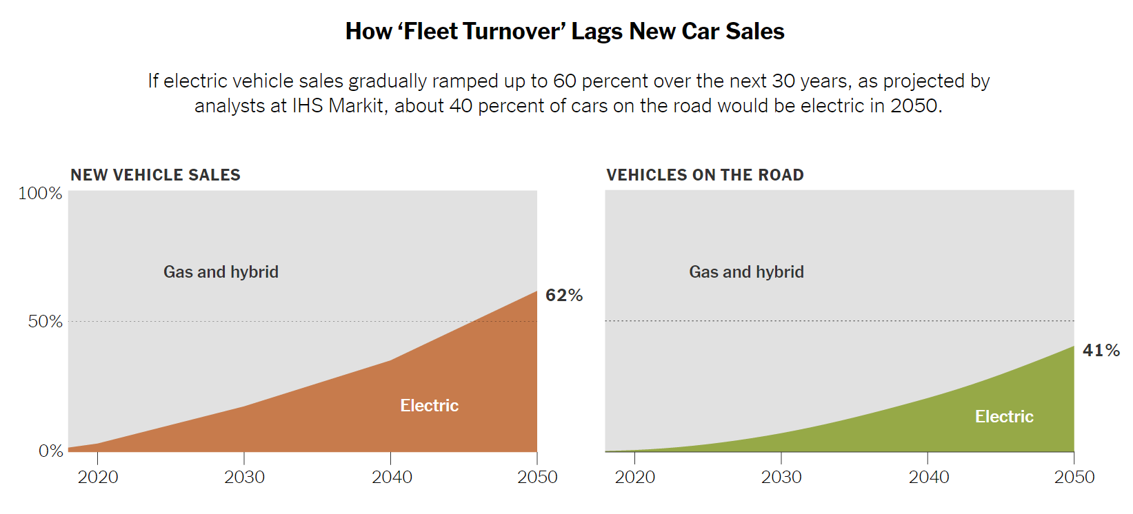In other words, full-scale adoption of EVs seems unlikely in the near term. The shift is likely to take place over many decades as batteries continue to improve. IHS Markit expects 62% of new car sales by 2050 to be electric over a 30-year shift. That seems like a reasonable estimate to me. Crucially, that would imply an 11% yearly growth in volumes. Impressive, but not explosive. And most of the shift will probably occur when cost parity is reached.