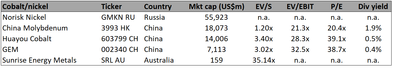 Nickel and cobalt are both key raw materials in the production of cathodes in batteries. Cobalt is a truly scarce resource, and a pure-play bet such as Huayou could be of interest for that reason.