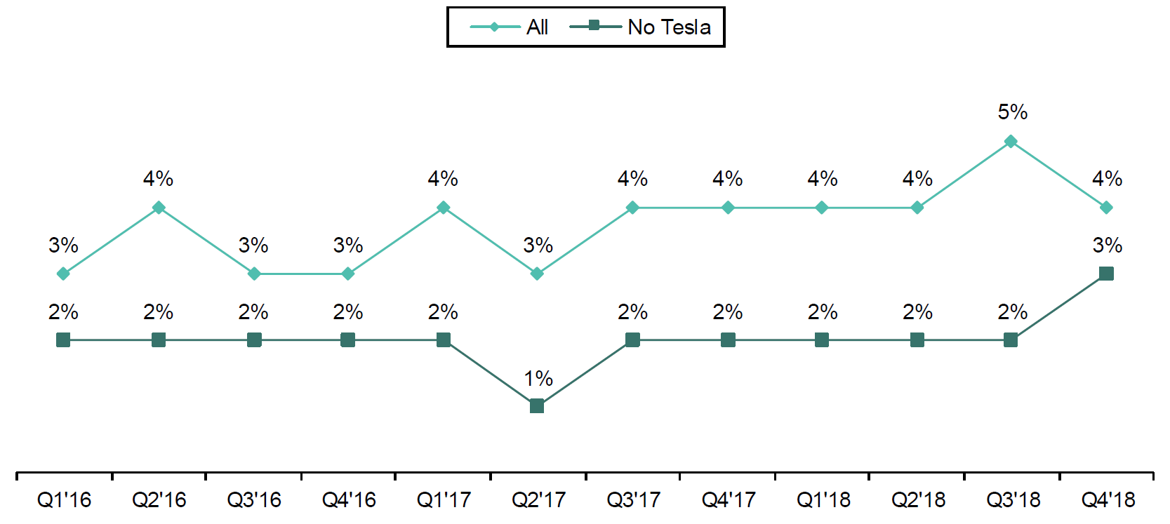 A Cox Automotive survey found that in 2018, around 4% of US car buyers considered an EV. That number had been roughly flat over the two preceding years.