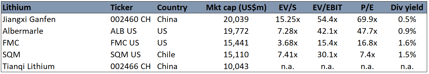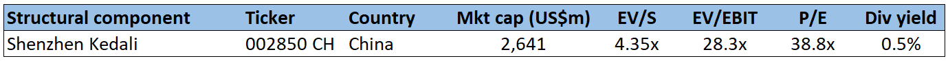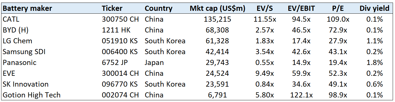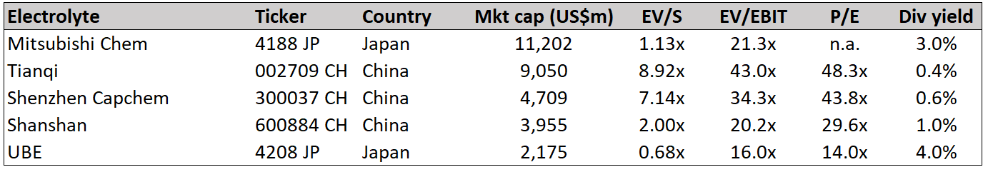 Guangzhou Tinci Materials and Shenzhen Capchem both seem to be relatively pure-play bets on electrolyte materials. In contrast, Shanshan, Mitsubishi Chemical have a presence across cathodes, anodes and electrolyte materials.