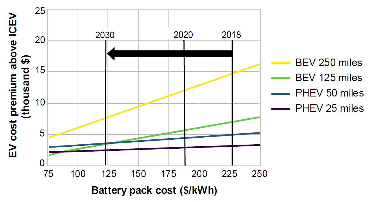 With the above assumption of US$124/kWh in battery pack prices, an EV with a 200-plus mile range will remain upwards of $5,000 more expensive than a similar ICE vehicle in 2030: