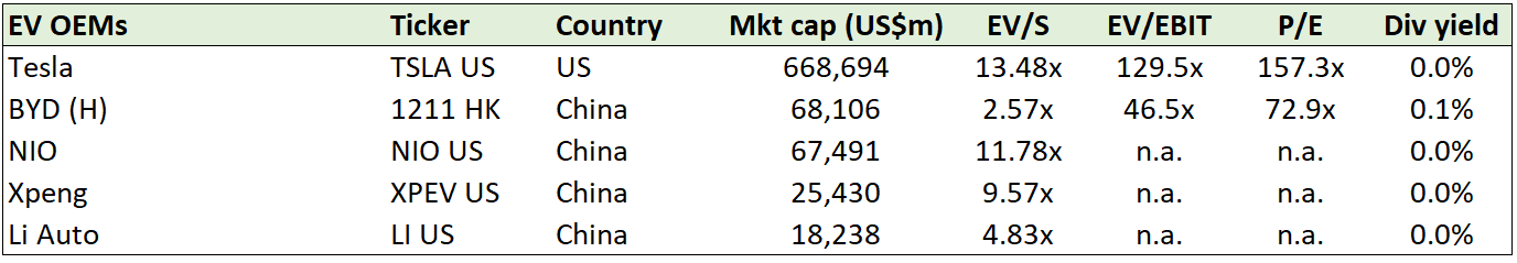 - European or Chinese auto OEMs are exposed to higher penalty charges and might be forced to sell EVs at low gross margins. Some of the Chinese auto stocks have risen significantly over the past year, despite minimal exposure to EVs.