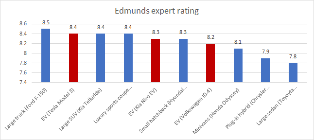 Expert reviews from Edmunds seem to be similar for EVs and ICE vehicles, with no apparent advantage between one and the other.
