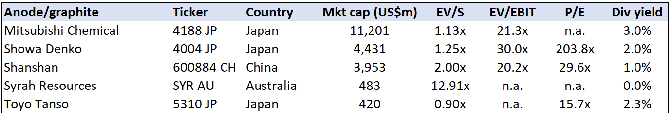 Mitsubishi Chemicals has a broad portfolio of chemical products. Showa Denko is involved in both petrochemicals and EV anode materials. Syrah Resources is an Australian miner with exposure to graphite, vanadium, mineral sands, copper, coal and uranium.