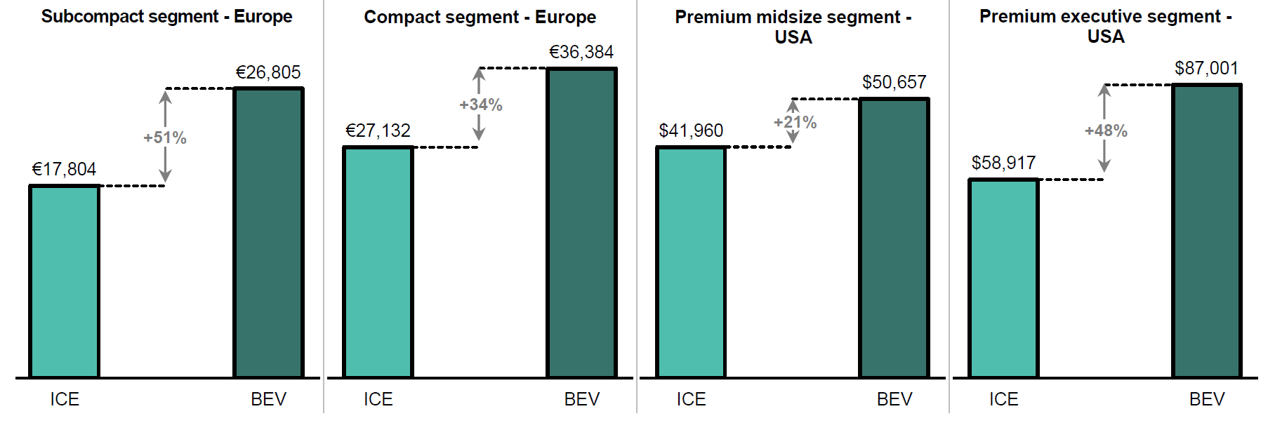 Higher prices. Today’s EVs cost around US$10,000 more than an equivalent ICE vehicle, and EV gross margins are not higher than those of ICE vehicles.