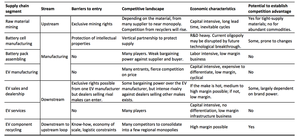 - Recycling: High margins could be possible in EV component recycling, due to the licensing requirements that are typically imposed for companies dealing with hazardous materials.
