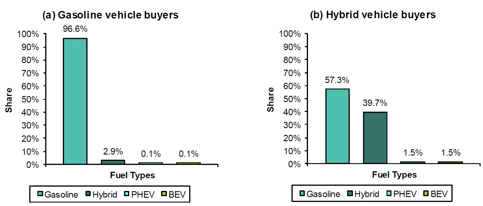 According to research from Xing, Leard and Li in 2019, existing ICE vehicle and hybrid buyers seem to have little interest in shifting to EVs. Fewer than 3.4% of current gasoline vehicle owners had an EV as a second choice. That number may increase, but it’s still relatively low.