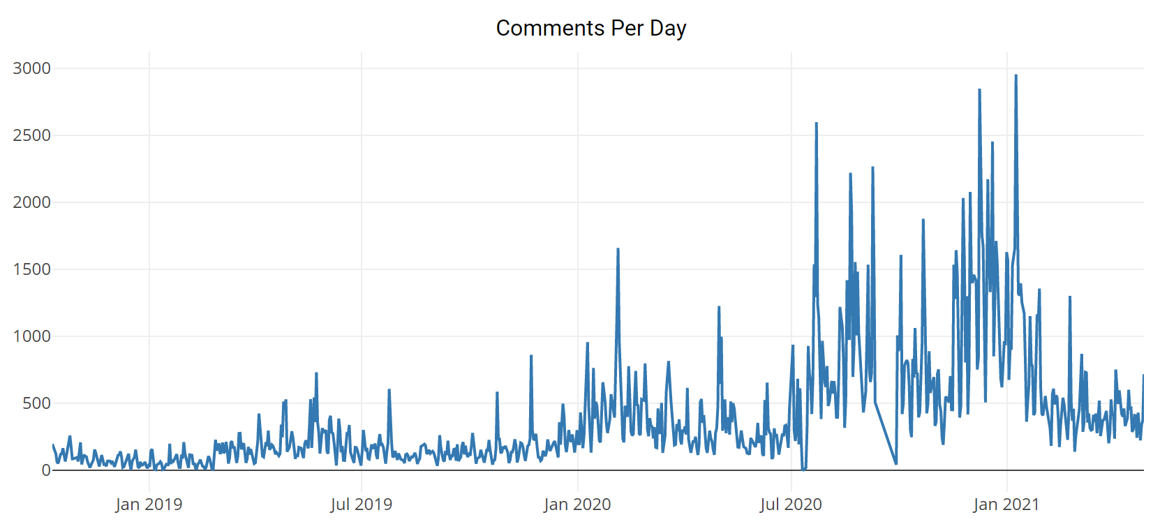 The number of comments per day on the r/TeslaInvestorsClub subreddit peaked in December 2020 after rising around 10x compared to 2019:
