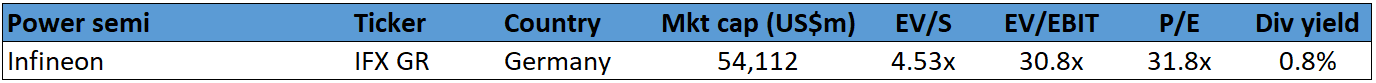 Semiconductor company Infineon has roughly 40% exposure to automotive power-related chips. Though the EV exposure is only around 6%, this proportion is likely to grow over the coming decades. The valuation multiple is high but comparable to other blue-chip semiconductor stocks.